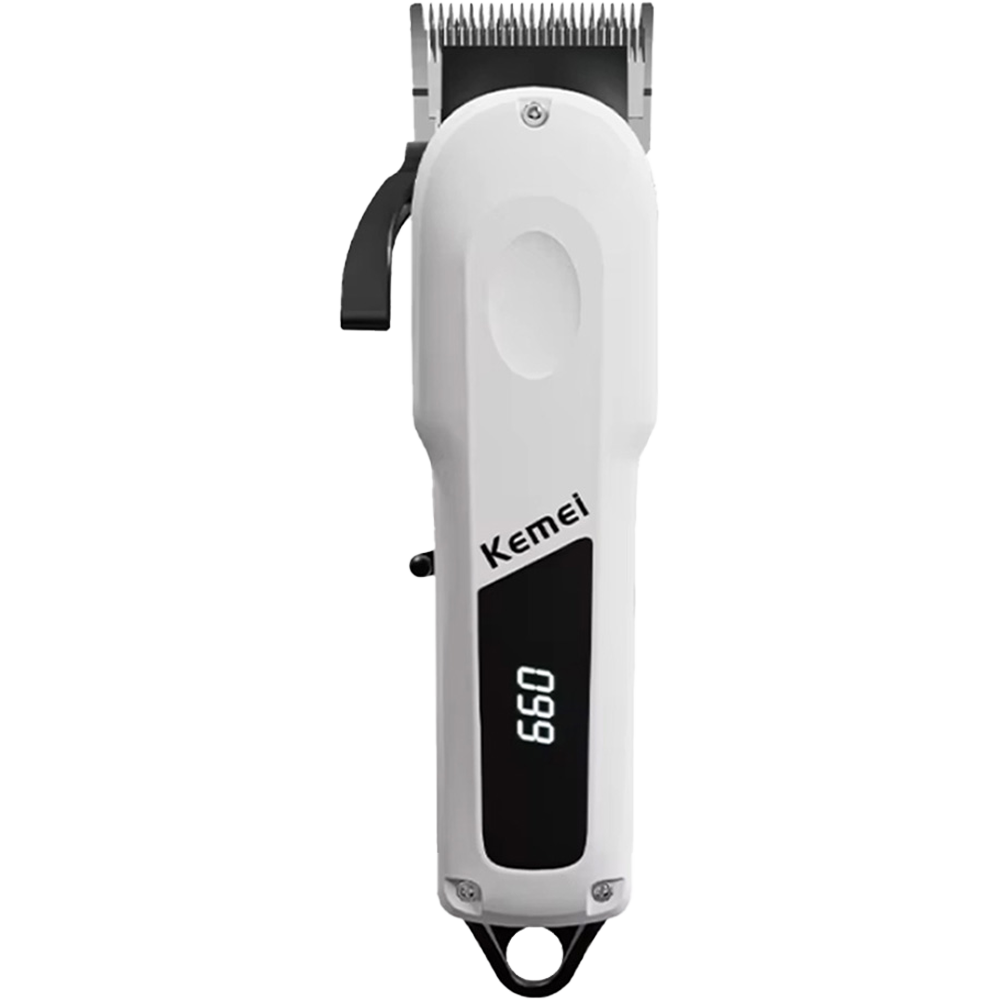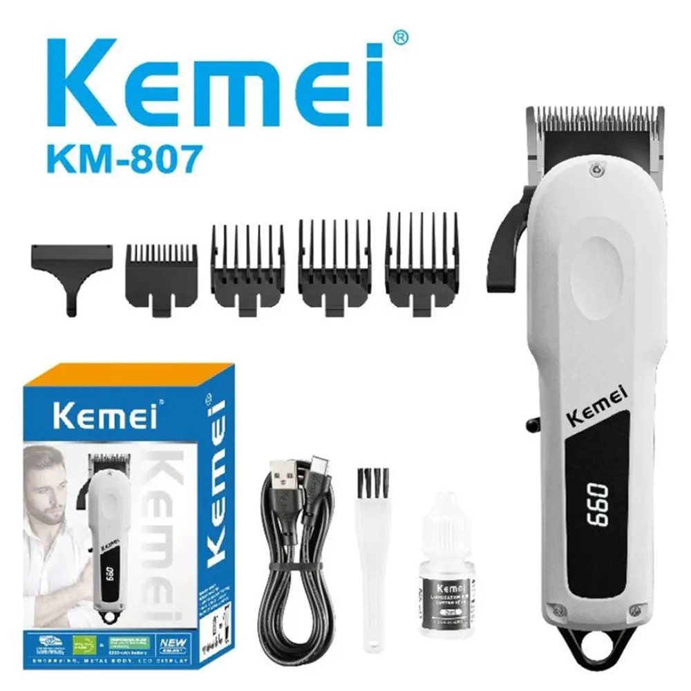 The Kemei KM-807 cordless hair clipper is a white USB Type-C beard trimmer for smooth trimming. This LED display cordless hair trimmer shows the battery level clearly. The adjustable-length men’s hair trimmer gives different cuts. It runs on a powerful 2000mAh lithium battery with a stainless steel cutter blade trimmer.